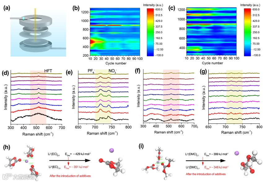 图3. (a) Li对称电池原位拉曼装置示意图。Li对称电池在(b)含有0.5% HFT+0.5% LiNO3电解液和(c)空白电解液中的原位拉曼光谱轮廓图。在(d, e)含有0.5% HFT+0.5% LiNO3电解液和(f, g)空白电解液中的300-650 cm-1和650-800 cm-1处的扩大光谱。(h) Li+(EC)2.4和Li+(EC)1.9的结合能。(i) Li+(DMC)2.1和Li+(DMC)1.7的结合能。