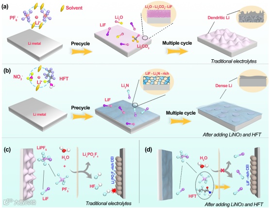 近日,上海大学蒋永研究员、赵兵研究员与上海理工大学窦士学院士合作,在国际知名期刊Advanced Energy Materials上发表题为“Multifunctional Additives to Realize Dendrite-Free Lithium Deposition in Carbonate Electrolytes toward Low-Temperature Li Metal Batteries”的研究论文。该论文通过在碳酸酯电解液中引入七氟丁酰胺(HFT)和LiNO3添加剂,成功地在锂金属表面原位构建了具有优异离子传输动力学和高机械强度的SEI层。由于七氟丁酰胺(HFT)中羰基(C=O)与Li+之间的强配位作用,可以促进LiNO3在碳酸盐电解液中的溶解。HFT和LiNO3双添加剂的引入首次在碳酸酯电解液中实现了溶剂化结构、离子传输动力学、去溶剂化能垒、成核能垒以及抑制HF生成的全面改善。相关结果通过原位光学显微镜、原位拉曼和以及XPS深度刻蚀表征手段得到充分论证。