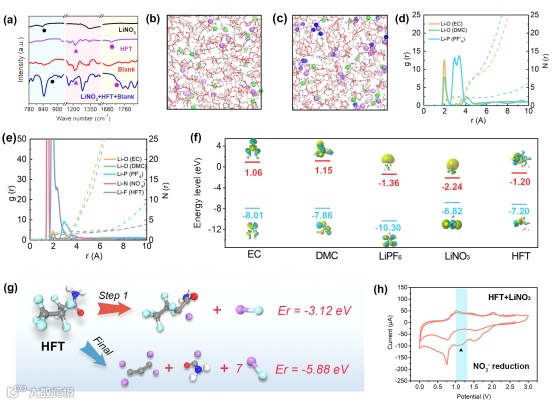 图2 (a) 纯LiNO3、HFT、纯碳酸酯电解液以及含有HFT/LiNO3的电解液的FTIR光谱图。(b, c) 空白电解液和含有HFT/LiNO3的电解液中Li+的溶剂化结构。(d, e) 相应的径向分布函数(g(r),实线)和配位数(n(r),虚线)。(f) EC、DMC、LiPF6、LiNO3和HFT的HOMO和LUMO能级。(g) 根据反应能计算提出HFT可能的分解机理。(g) 含有HFT和LiNO3的Li||Cu半电池的CV曲线。
