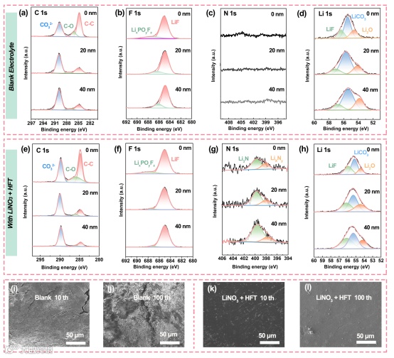 图4. 循环后SEI结构和锂表面形貌表征。锂负极在空白电解质(a-d)和含有0.5% HFT+0.5% LiNO3的电解液(e-h)中循环10次后形成的SEI的C 1s、F 1s、N 1s和Li 1s的XPS光谱(分别在0、20和40 nm的溅射深度下进行)。在1 mA cm-2电流密度和1 mAh cm-2容量下,电极循环10次和100次后的SEM照片(i, j)在空白电解质中和(k, l)在含有0.5% HFT+0.5% LiNO3的电解液中的电极表面形貌。