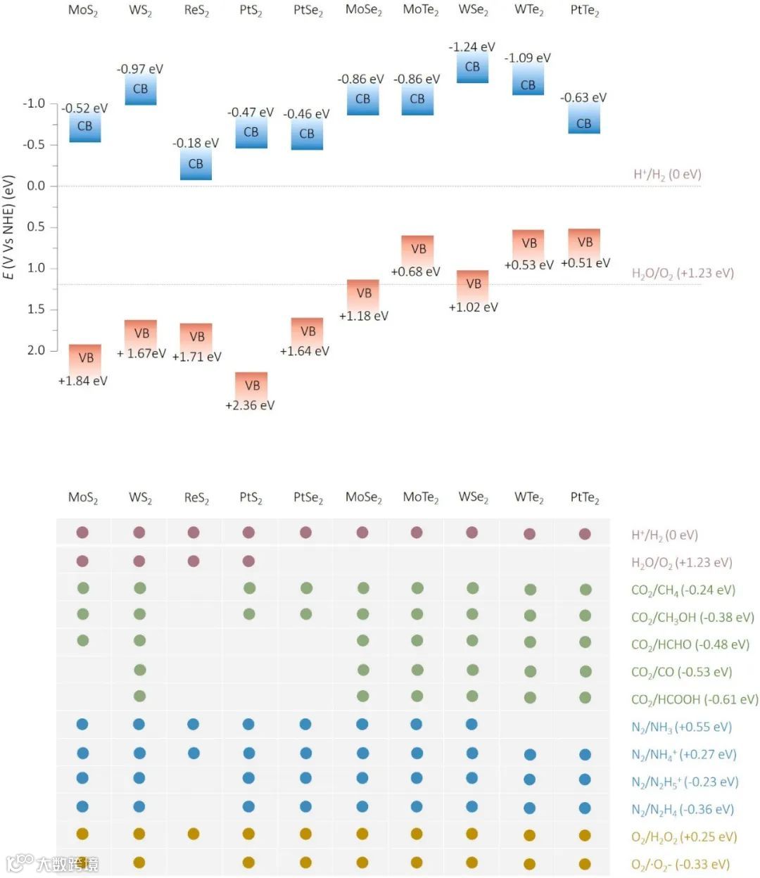 图10 | 2D TMDs的合适的能带位置和一些常见光催化反应的氧化还原电势。