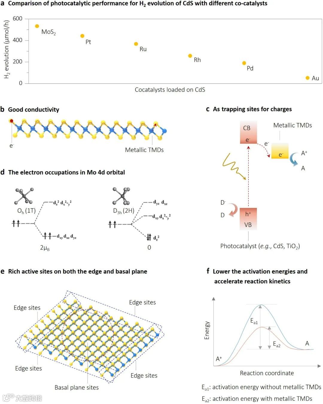 2D TMDs(特别是其金属相晶体,例如1T-MoS2)是光催化中有前途的助催化剂。它们是贵金属的理想替代品,甚至有可能在性能上超越贵金属。例如,作为助催化剂的2D MoS2和WS2显示出比贵金属(包括Pt、Pd、Rh、Ru和Au)更好的促进CdS光催化产H2的效果。