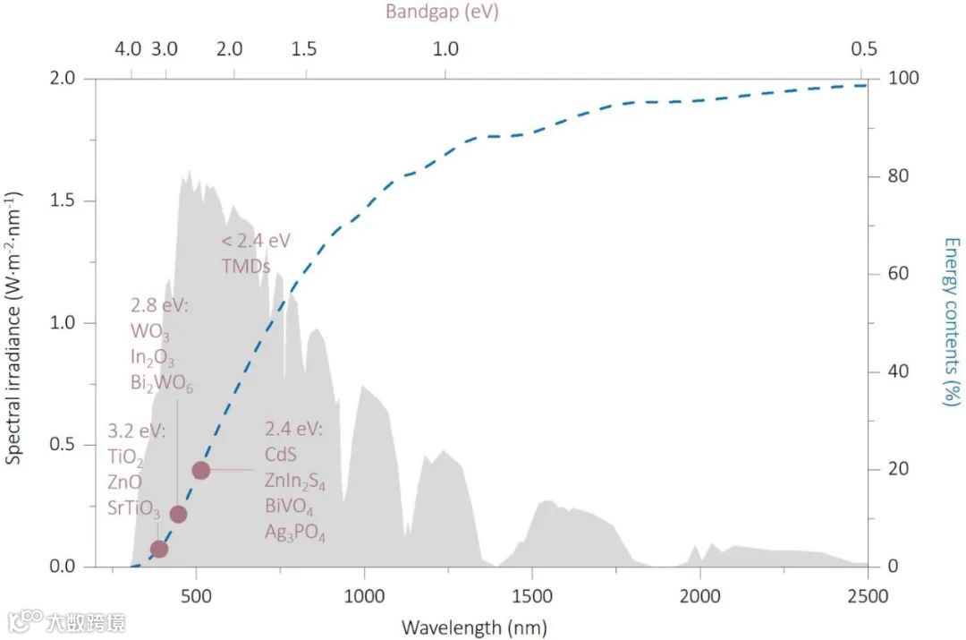 (2) 最佳的光催化剂需要同时保持太阳辐射光谱中的宽光吸收(需要窄带隙)和强氧化还原能力(需要宽带隙),但它们的实现本质上是矛盾的;