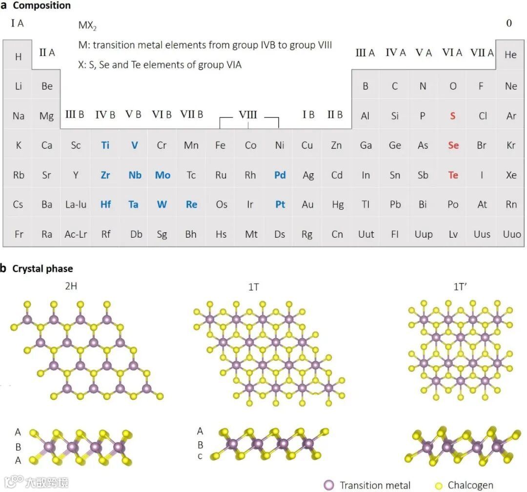 TMDs通常标记为MX2,其中M表示IVB族至VIII族的过渡金属元素,X表示VIA族的S、Se和Te元素,如MoS2. TMDs主要包括3种晶相,即2H(三棱柱形)、1T(八面体)和1T′(畸变八面体)。TMD具有可调谐(取决于厚度)的电子带隙,源于量子限域效应。