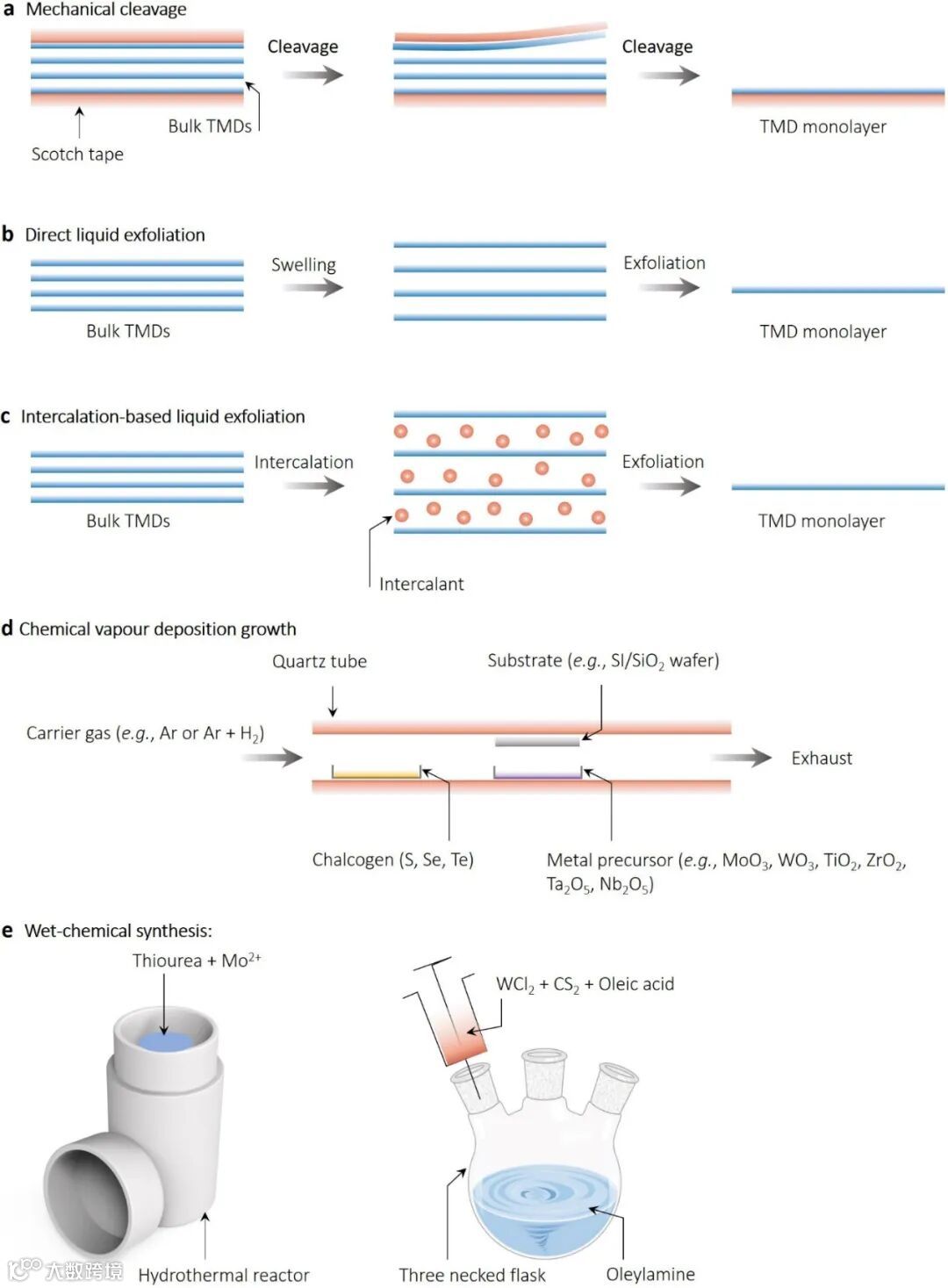 理想情况下,2D TMDs的合成方法可分为两类:自上而下的剥离(从大块到2D纳米片;例如机械剥离,直接液相剥离,和基于插层的液相剥离)和自下而上的合成(从小构建块分子到2D纳米片材;例如化学气相沉积生长,湿化学合成。过去几年还出现了一些用于生产2D TMD的新策略,例如分子束外延(MBE)、原子层沉积(ALD)、脉冲激光沉积、和通过平面表面等离子体激元(SPPs)进行的原子层蚀刻。这些技术的出现丰富了2D TMD制备的工具箱。