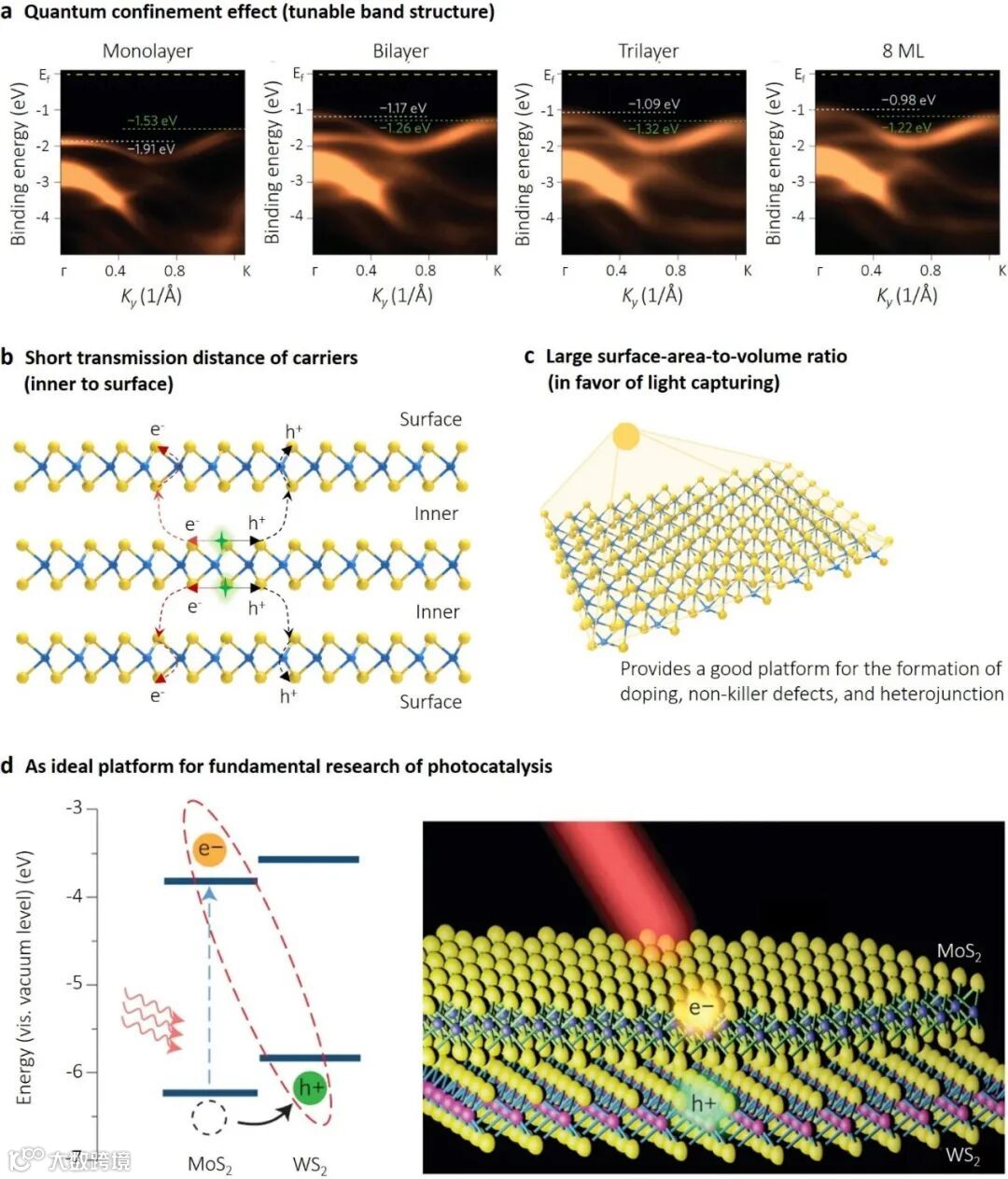 半导体相2D TMD(例如2H-MoS2)是活性光催化剂(光收集材料)的潜在候选者。它们作为活性光催化剂的优势包括:窄带隙(通常小于2.4eV,例如MoS2单层的2.16eV),合适的能带位置,原子薄的属性,作为光催化基础研究的理想平台等。