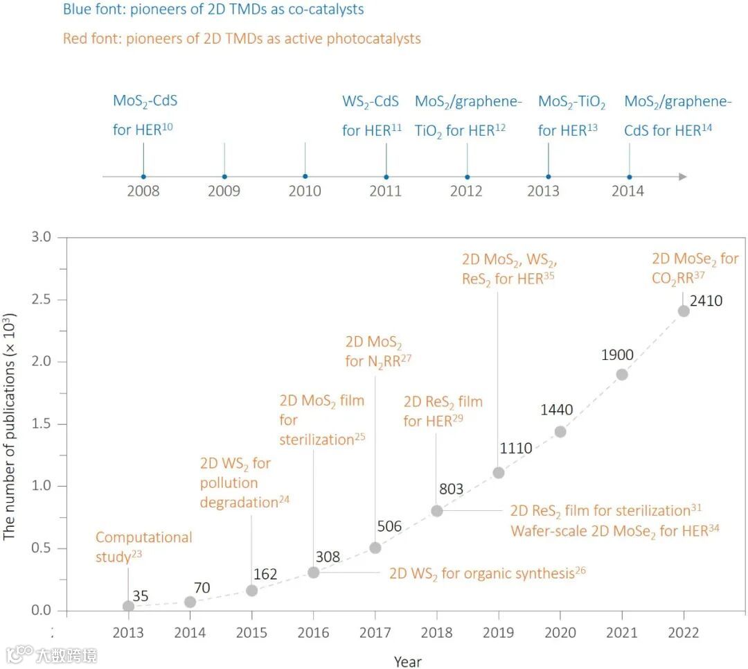 图1 | 用于光催化的2D TMDs的研究先驱和年度出版物数量。
