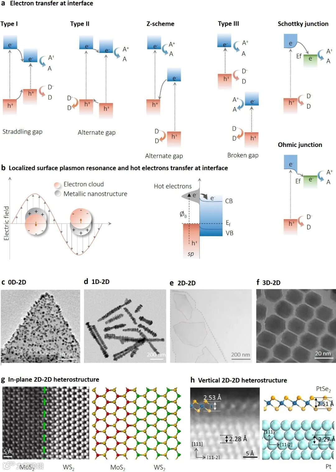 当界面形成时,载流子迁移将表现出很强的方向性。这种强方向性有助于光生载流子的有效分离,从而延长其寿命并提高光量子效率。因此,当我们开始构建基于2D TMDs的异质结界面时,出现了大量提高光催化性能的机会。设计良好的基于二维TMDs的异质结界面应能带匹配、尺寸(几何)匹配和化学相容性。