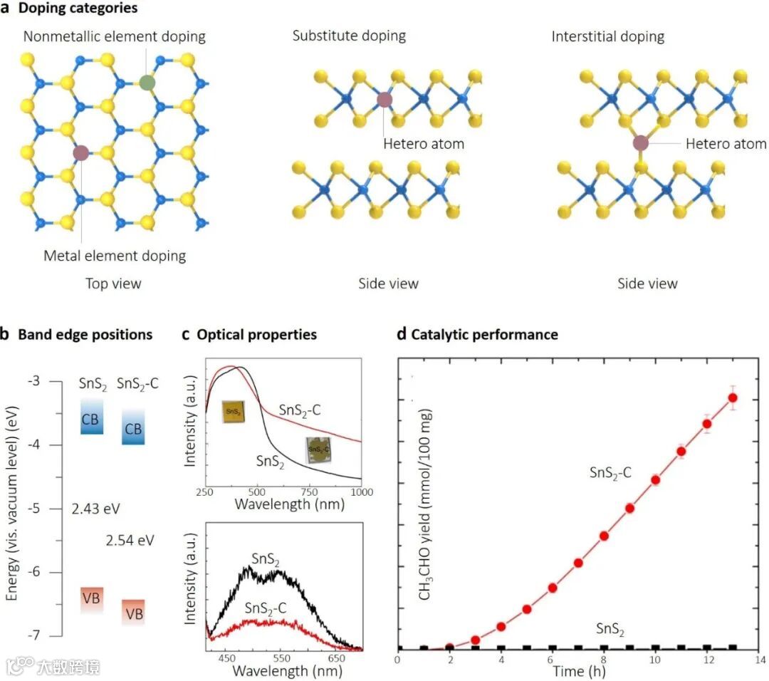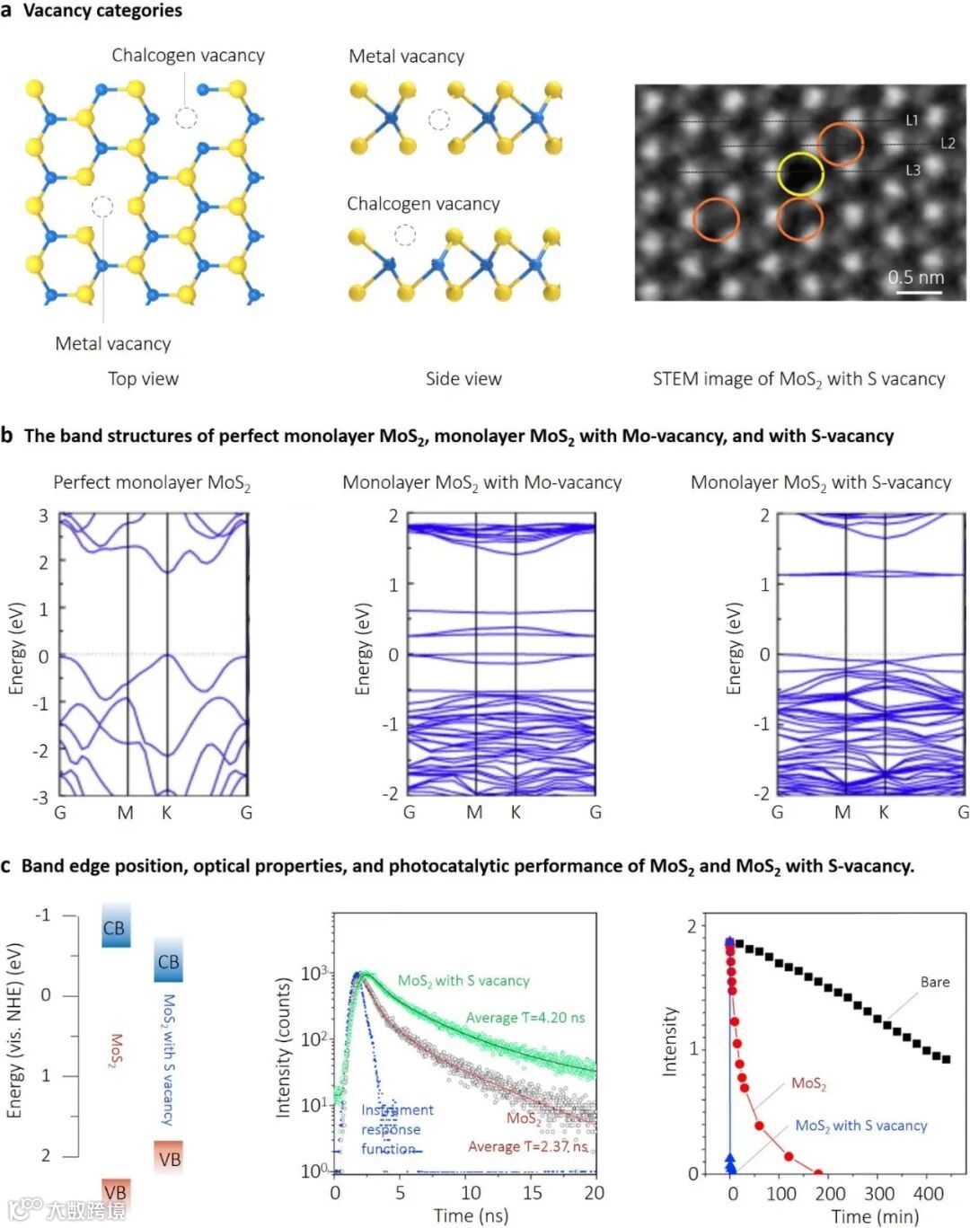 将杂原子引入半导体2D TMD可以有效地改变其光电性能(例如,有效地增强光吸收并延长载流子寿命),从而提高其光催化性能。创建空位也是一种普遍的策略,以释放2D TMD在光催化性能改善方面的巨大潜力。这是因为它可以调整2D TMD的电子结构和相邻原子排列,以提高固有活性。此外,作为载流子阱,它也有利于分离光生电子和空穴,延长其寿命,从而提高光催化性能。