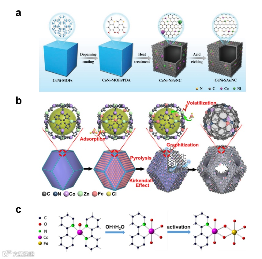一步法是指在制备DAC的过程中在基底上同时引入两种金属。常见的一步法是将这两种金属负载到金属有机框架(MOF)或者其他基底上,通过高温热解获得DAC。与之相比,两步法策略通过化学锚定或物理吸附在基底上依次引入两种金属原子来构筑DAC或者DAC 前驱体。相比于一步法策略,两步法策略降低了双原子位点形成过程中的不确定性。