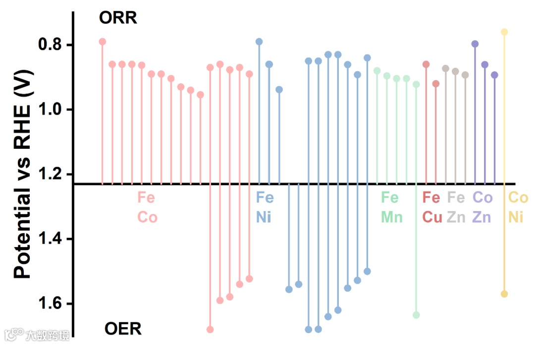 数据统计结果表明,含Fe的DAC(Fe–Co DAC, Fe–Mn DAC以及Fe–Ni DAC)具有很好的ORR性能,其半波电位最高可达0.954 V vs. RHE。在OER电催化方面,Fe–Ni DAC 和 Fe–Co DAC具有显著优势。结合ORR以及OER性能来看,Fe–Ni DAC 和 Fe–Co DAC是双功能催化的优势体系,目前报道的最好的双功能性能ΔE 约为0.64 V。