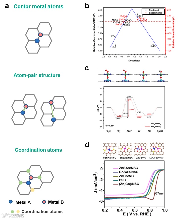DAC中的金属原子对在催化反应的过程中可以提供两个潜在的反应(吸附)位点,这样独特的结构有利于催化多中间体参与的ORR/OER过程。此外,DAC中金属原子之间的短程相互作用(1−5 Å)也使其具有独特的电子结构。