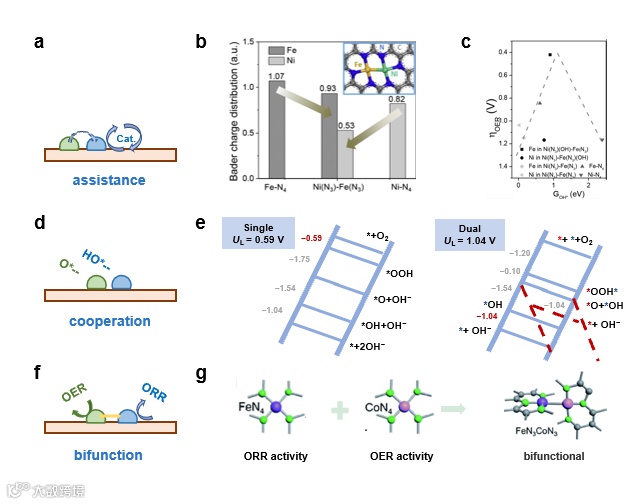在此基础上,本工作也从电子结构的角度(电荷分布、能带结构和电子自旋态)深入阐释了DAC的催化活性来源(图3)。与SAC相比,第二种金属原子的引入通常会使DAC金属位点上的净电荷发生变化,从而优化对中间体的吸附能并获得更好的催化性能。同时DAC中两个金属原子之间的相互作用会影响催化剂的能带结构,改变金属位点与氧中间体态密度的重叠程度。通常情况下,重叠程度大意味着电子更容易发生转移。