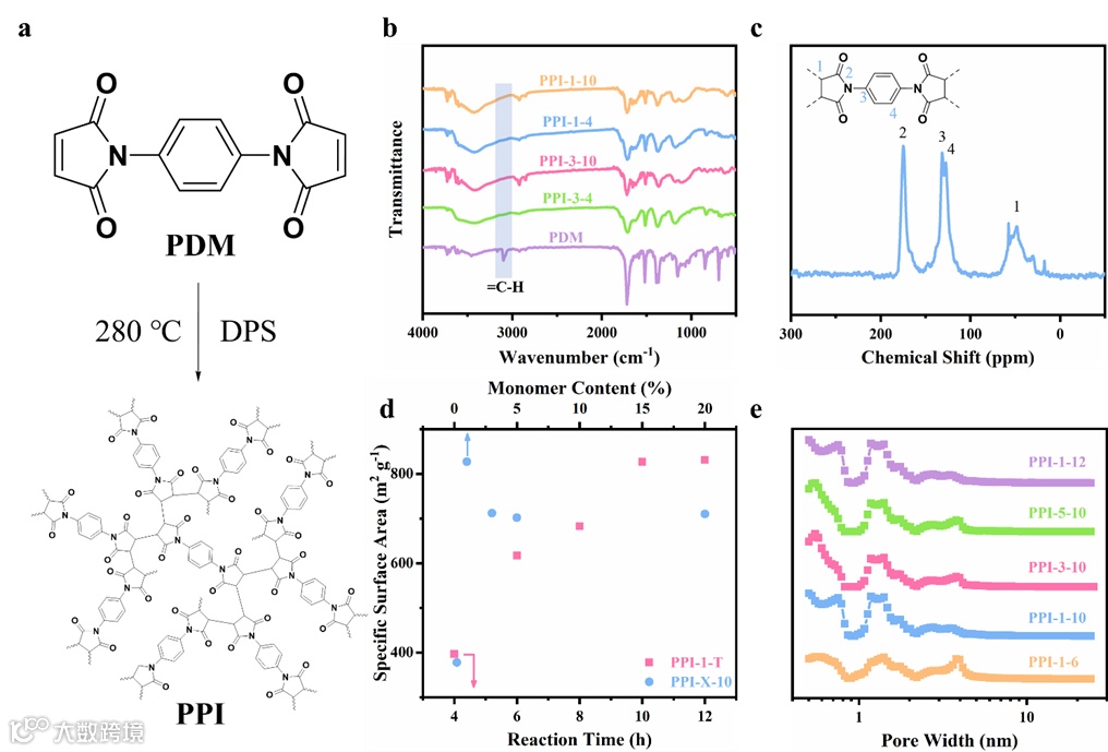 通过调控聚合反应时间以及聚合单体(N,N'-(1,4-亚苯基)双马来酰亚胺,PDM)和溶剂(二苯砜,DPS)的质量比能够调控制备的多孔聚酰亚胺(PPI)的比表面积,以制备出具有高比表面积的多孔聚酰亚胺(PPI-1-10),这有利于改善电池的循环稳定性(图1)。
