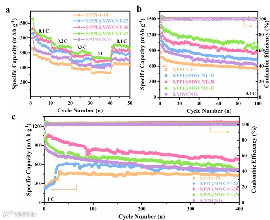图5:S/PPI-1-10, S/PPI@MWCNT-Y, S/MWCNTs半电池的循环性能