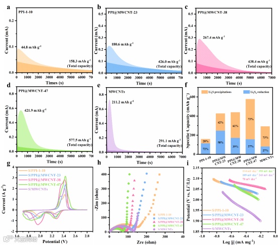 通过循环伏安、Li2S的沉积测试、电化学阻抗测试等电化学测试的结果表明,在PPI@MWCNT-Y中,介孔的多壁碳纳米管(MWCNTs)核能够构建连续的导电网络,加速电极内部电子和锂离子的传输,从而改善硫正极的氧化还原反应速率。微孔聚酰亚胺(PPI)壳的微孔和极性结构能够抑制多硫化物向负极的扩散以抑制穿梭效应(图4)。