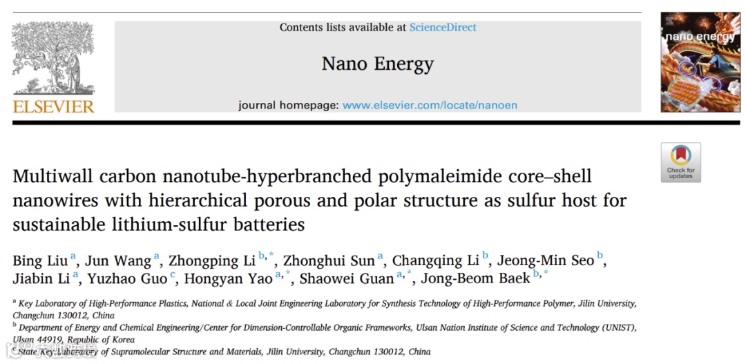 近日,吉林大学的关绍巍教授、姚洪岩副教授与来自蔚山科学技术院的Jong-Beom Baek教授、李忠平副教授合作,在国际知名期刊Nano Energy上发表题为“Multiwall Carbon Nanotube-Hyperbranched Polymaleimide Core–Shell Nanowires with Hierarchical Porous and Polar Structure as Sulfur Host for Sustainable Lithium-Sulfur Batteries”的文章。本工作通过简便的一锅法制备了一种具有分级多孔结构的复合多孔核壳纳米线(PPI@MWCNT-Y),并将其用于锂硫电池的正极载体。