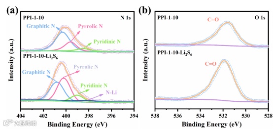 为了探究PPI与多硫化锂之间的相互作用,采用XPS测试表征吸附多硫化物的PPI-1-10和原始的PPI-1-10。测试结果表明PPI-1-10中的N、O原子能够与多硫化物通过电子转移产生化学相互作用,以抑制多硫化物的穿梭效应(图3)。