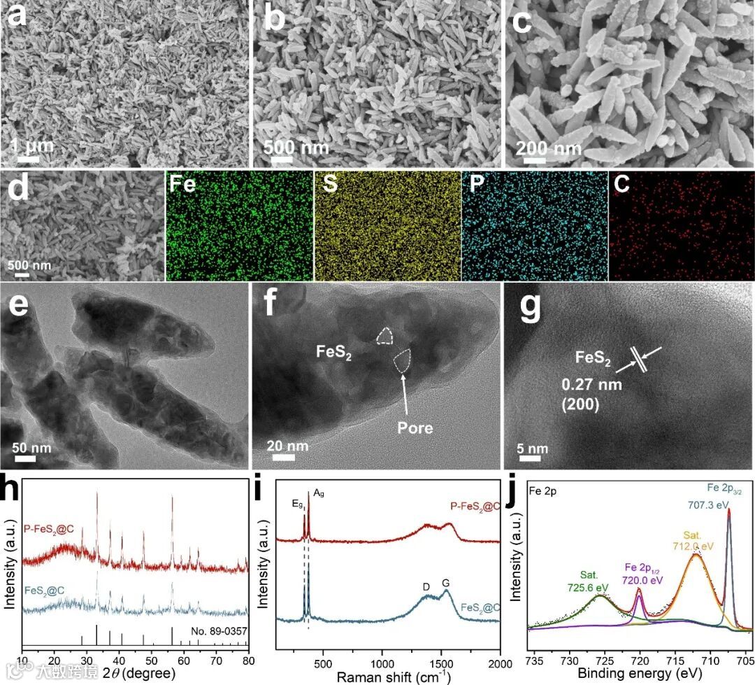 图2 纺锤体P-FeS2@C材料的结构表征
