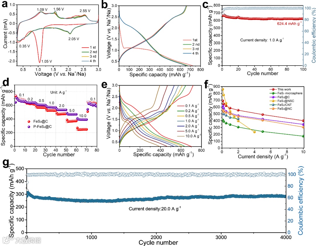 通过电化学测试发现,相较于未掺杂的FeS2@C材料来说,P-FeS2@C材料呈现出更高的储钠比容量。随着电流密度的增加,两者容量的差别逐渐明显,在10.0 A g-1的电流密度下P-FeS2@C可提供401.2 mAh g-1的比容量,远高于未掺杂的FeS2@C负极。此外,在20 A g-1的电流密度下循环4000圈后,其容量仍然高达284.5 mAhg-1。