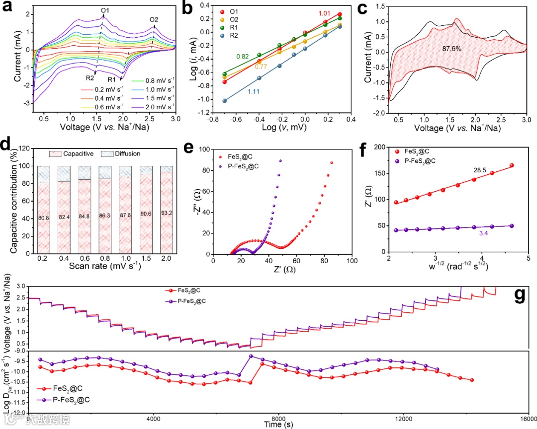 结合不同扫速下的CV曲线和GITT曲线分析其动力学可知,磷的引入可以显著提高硫化铁负极的赝电容占比,并且其钠离子扩散速率得到明显改善,为其优异的倍率性能提供了合理的解释。