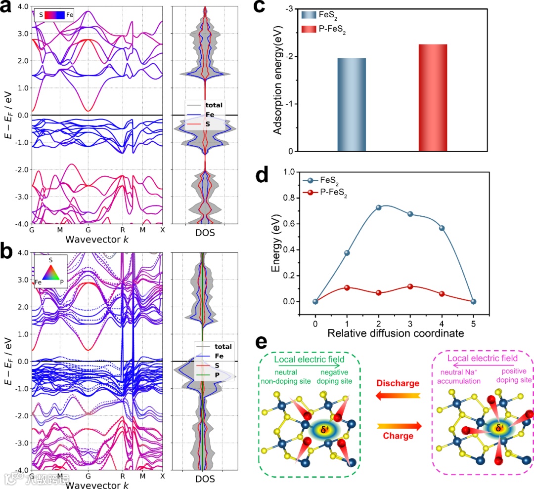 图6(a)FeS2和(b)P-FeS2的能带结构。FeS2和P-FeS2对钠离子的(c)吸附能和(d)扩散能垒。(e)内建电场的作用机制。