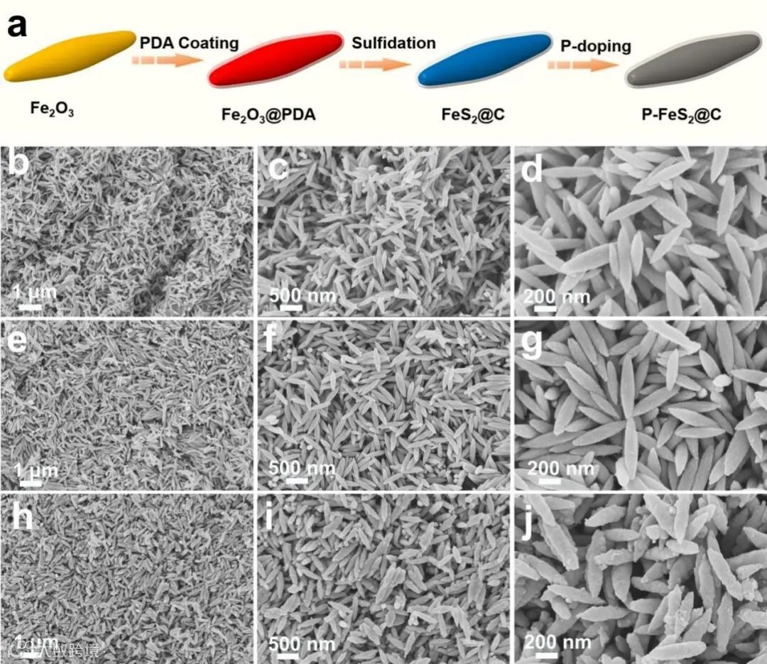 在该工作中,作者首先通过水热反应、原位湿法包覆PDA以及硫化处理合成纺锤体结构的FeS2@C作为前驱体,结合低温磷化策略实现原位磷掺杂(P-FeS2@C),作为钠离子电池时表现出了较高的比容量和超稳的循环性能,并且磷的引入显著改善了钠离子扩散速率,实现了优异的倍率性能。