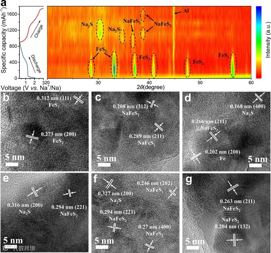 采用非原位XRD、TEM、SAED对P-FeS2@C负极的储钠机理进行了研究。通过采集不同放电/充电状态下的XRD图谱分析可知,在初始放电过程中首先发生插层反应生成中间产物NaxFeS2;随着钠化程度的加深,NaxFeS2发生转换反应生成Na2S和单质Fe(在XRD图谱中未探测到Fe的衍射峰,可能是由于其超细晶粒以及较差的结晶度)。在充电过程结束后,重新出现NaxFeS2的特征峰,未观察到FeS2的衍射峰,这也说明FeS2负极在首圈储钠过程中存在不可逆的相变。此外,通过非原位TEM和SAED图同样揭示了与非原位XRD相一致的结果。