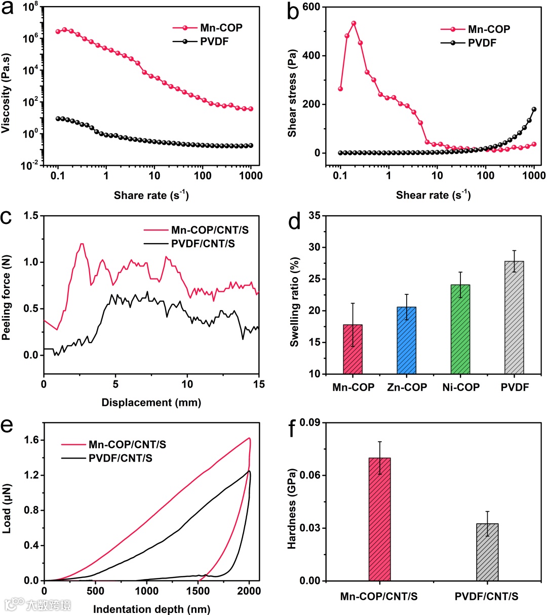 图3. 不同粘结剂的特性。(a) Mn-COP和PVDF粘度-剪切速率曲线。(b) Mn-COP和PVDF的剪切强度。(c) Mn-COP/CNT/S和PVDF/CNT/S电极的剥离强度曲线。(d) M-COP/CNT/S (M = Mn、Ni和Zn)和PVDF/CNT/S电极的溶胀率。(e) Mn-COP/CNT/S和PVDF/CNT/S电极的纳米压痕曲线。(f) Mn-COP/CNT/S和PVDF/CNT/S电极的硬度。
