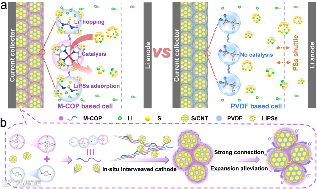 图1. 基于有机聚合物(M-COP,M = Mn、Ni和Zn)粘结剂的电池相对于基于PVDF的电池的优势及其原位正极编织策略示意图。