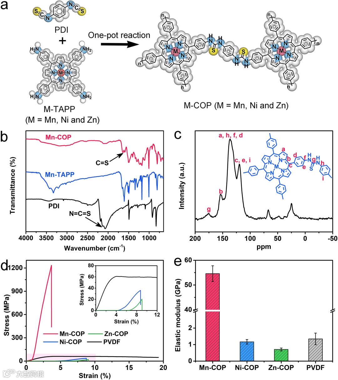 M-COP(M = Mn、Ni和Zn)通过金属卟啉(MTAPP,M = Mn、Ni和Zn)和1,4-二异氰酸酯(PDI)的组装,经由硫脲形成缩合反应通过简单的加热聚合工艺制备。应变-应力测试显示Mn-COP能承受的最大拉应力为(1.23 GPa,3.67%),远优于Ni-COP(0.036 GPa,8.76%)和Zn-COP(0.020 GPa,9.04%)。
