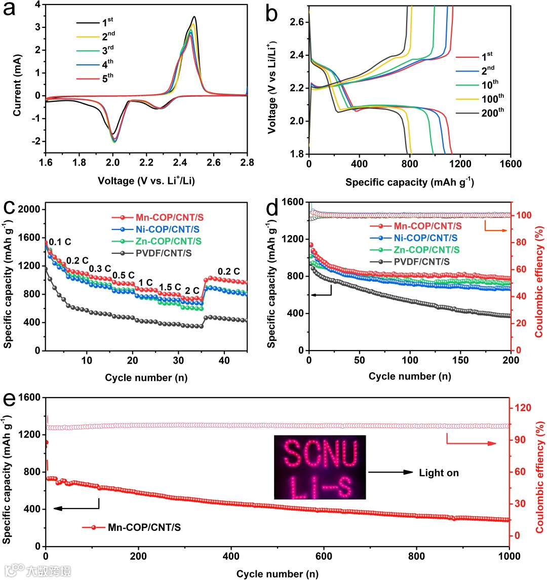 图4. 含有不同粘结剂锂硫电池的电化学性能。(a) 基于Mn-COP/CNT/S的Li-S电池在1.6 - 2.8 V的电压范围内以0.1mV·S-1的扫描速率的CV曲线,(b) 基于Mn-COP/CNT/S的Li-S电池在0.5 C下不同循环次数下的充放电曲线,(c) 具有不同粘结剂的Li-S电池的倍率性能。(d)具有不同粘结剂的Li-S电池在0.5 C下的循环性能。(e) 具有Mn-COP的Li-S电池在4 C下的循环性能(插图是电池点亮LED面板时的照片)。