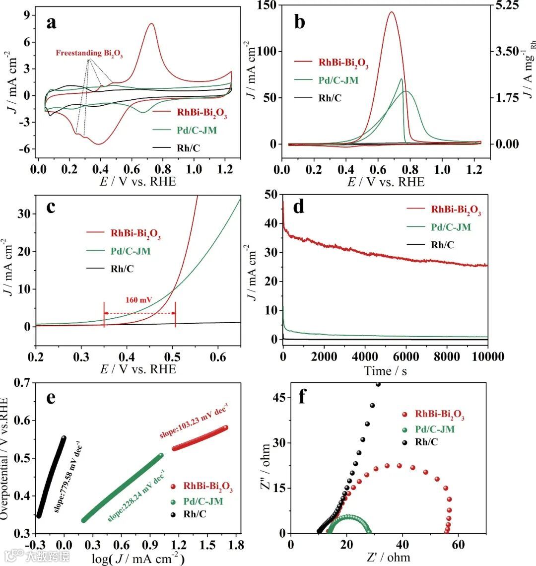 RhBi-Bi2O3催化剂表面的EOR峰值电流高达约5000 mA mg-1 Rh,分别比单金属Rh/C催化剂和Pd/C-JM高约80倍和2.5倍,展示出了优异的EOR催化活性。同时,RhBi-Bi2O3催化剂也表现出比Rh/C低160mV的起始电位以及优异的电化学稳定性。另外,Tafel斜率以及EIS均较于Rh/C得到明显提高。