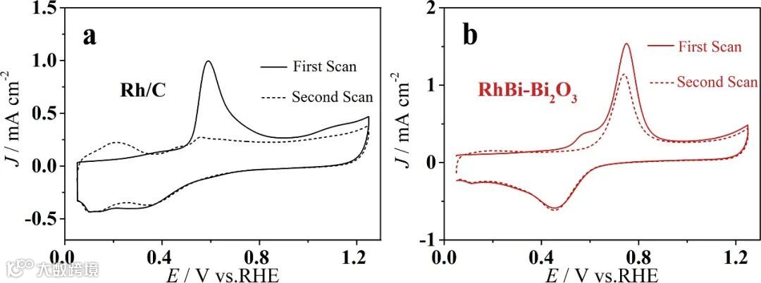 Bi原子加入可削弱COad表面吸附。CO-stripping实验结果表明,COad可以很容易吸附在Rh/C表面,而只有微量的COad可以吸附在RhBi-Bi2O3的表面,换句话说,表面毒性中间物在RhBi-Bi2O3表面的吸附被削弱了,其可能的原因是Bi原子的加入使得下移d带中心,削弱了COad在催化剂表面的吸附。