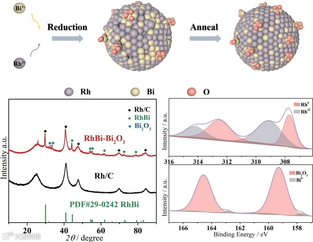 图2. (a)RhBi-Bi2O3催化剂合成示意图;(b)XRD图谱(c-d)XPS图谱。