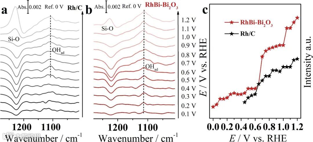 Bi2O3可富集含氧物种OHad。原位ATR-SEIRA结果表明,在0.1 M NaOH溶液中RhBi-Bi2O3表面的OHad物种出现的电位(约0.1V)远低于Rh/C(约0.5V)。同时,RhBi-Bi2O3表面的OHad物种的表面覆盖率高于Rh/C,这极大程度上促进了COad的快速去除。