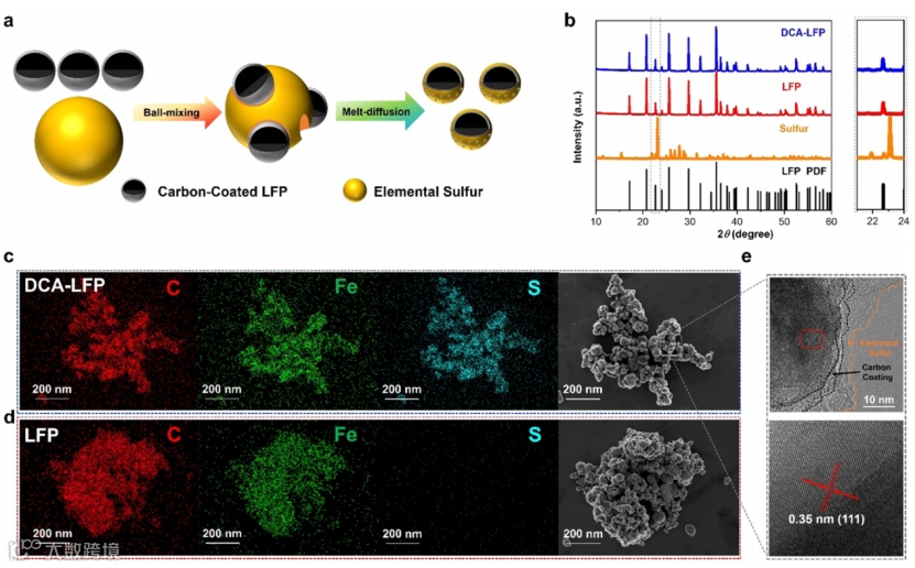 图2a描述了设计正极添加剂功能化LiFePO4 (DCA-LFP)粉末的制备过程。图2b为DCA-LFP(含0.5 wt %的S)粉末的PXRD图,在DCA-LFP中未检测到S的衍射峰,原因可能是S含量较少或其为无定形状态。