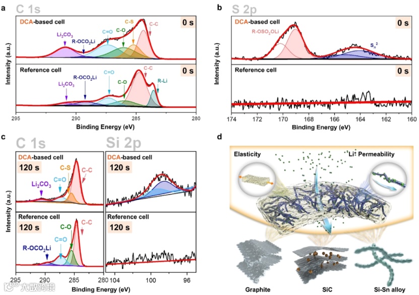 图5 SiC450||LFP和SiC450||DCA-LFP电池10次循环后,SiC450电极(a)C 1s和(b)S 1s的XPS图谱;(c)SiC450||DCA-LFP电池10次循环后的SiC450电极Ar离子溅射测试C 1s和Si 2p的XPS图谱;(d) DCA基电池中SEI形成的机理。