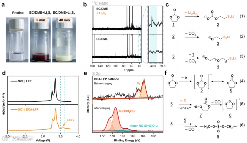 图3 (a)原始EC/DME以及加入Li2S8的EC/DME之后5min和40min的对比图;(b)引入Li2S8后,EC/DME溶液上清液12 h的13C NMR谱,以EC/DME作为参考比较;(c)EC与Li2S8可能发生的化学反应;(d)SiC450||DCA-LFP和SiC450||LFP电池的dQ/dV曲线;(e)充电前后,DCA-LFP正极S 2p的XPS谱;(f)单质硫在正极侧氧化的可能反应机理。