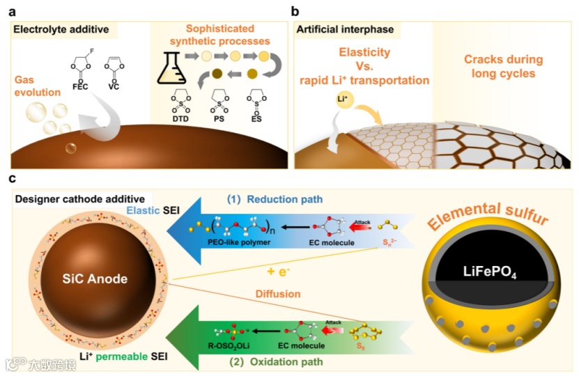 图1 (a)电解质添加剂,(b)人工界面膜,(c)设计阴极添加剂对SEI构建的影响示意图;LFP和SiC分别作为正、负极。(1)单质硫直接扩散到负极侧,转化为多硫化物,通过还原的途径与EC反应,在负极上形成PEO型聚合物。(2)单质硫通过正极侧的氧化反应生成R−OSO2OLi,扩散到负极。