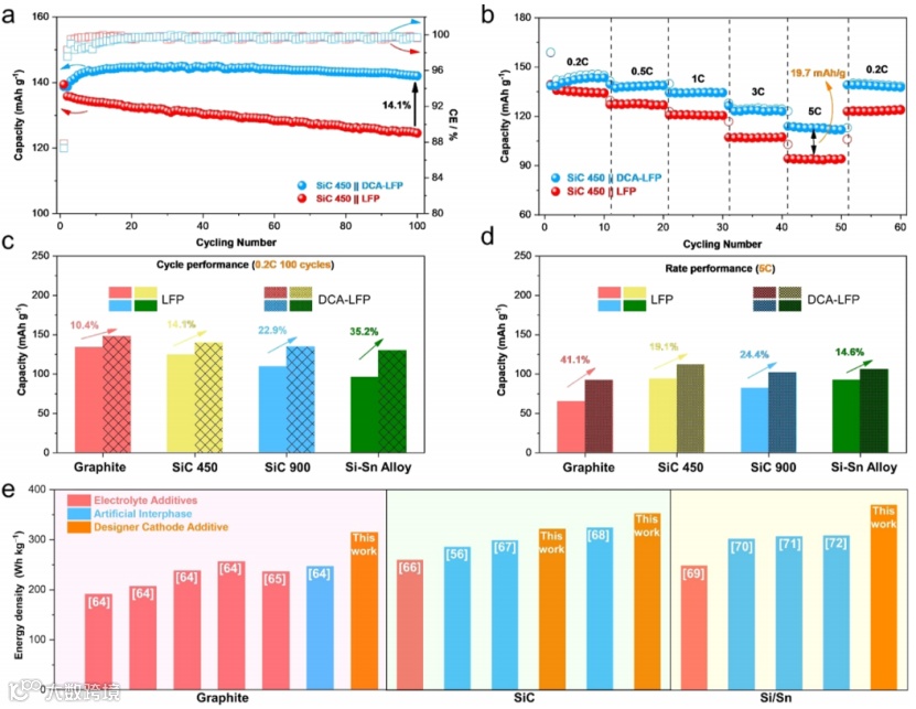 图4 (a) SiC450||LFP和SiC450||DCA-LFP电池前100个充放电循环的稳定性测试和库仑效率;(b)SiC450||LFP和SiC450||DCA-LFP电池的倍率性能测试。石墨||LFP、石墨||DCA-LFP、SiC450 ||LFP、SiC450||DCA-LFP、SiC900||LFP、SiC900||DCA-LFP、Si−Sn合金||LFP、Si−Sn合金||DCA-LFP电池的循环稳定性(c)和倍率性能(d);(e)使用电解液添加剂、人工界面相和DCA循环100次后,不同负极||LFP电池体系的质量能量密度对比。