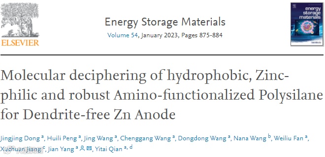 有鉴于此,来自山东大学的杨剑教授在国际知名期刊Energy Storage Materials上发表题为“Molecular Deciphering of Hydrophobic, Zinc-philic and Robust Amino-Functionalized Polysilane for Dendrite-free Zn Anode”的研究文章。