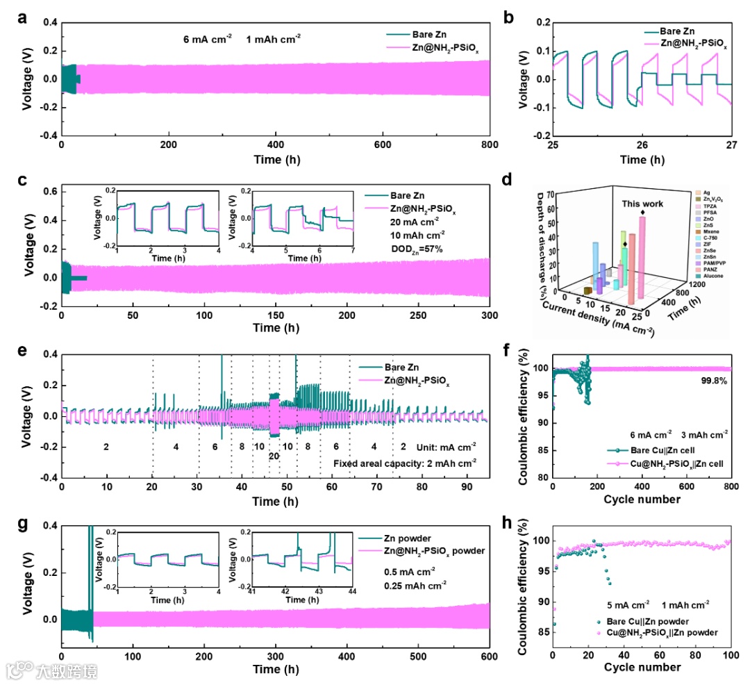 为了评估锌负极的电化学性能,组装了Zn||Zn对称电池和Zn||Cu半电池进行测试。使用Zn@NH2-PSiOx组装的对称电池在6 mA cm-2和1 mAh cm-2时展现出优异的稳定性(800 h) (图2a)。当电流密度和面容量分别增加到20 mA cm-2和10 mAh cm-2, 放电深度达到57.0%,Zn@NH2-PSiOx电极依然能够稳定循环300 h (图2c)。