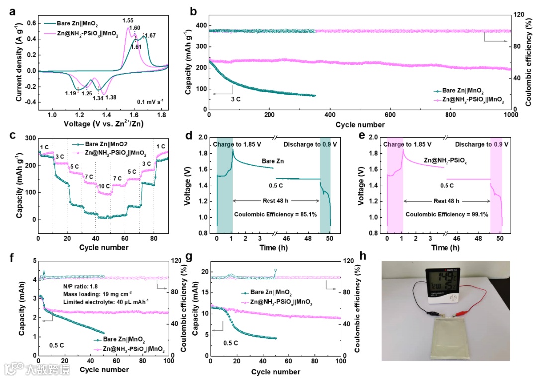 图6 Bare Zn||MnO2 和 Zn@NH2-PSiOx||MnO2 纽扣电池的(a) CV曲线,(b) 循环性能,(c) 倍率性能,(d, e) 自放电性能测试,Bare Zn||MnO2 和 Zn@NH2-PSiOx||MnO2 (f) 纽扣电池在严格的实验条件下的性能测试,(g) 软包电池性能测试,(h) 为数字计时器供电的软包电池图片。