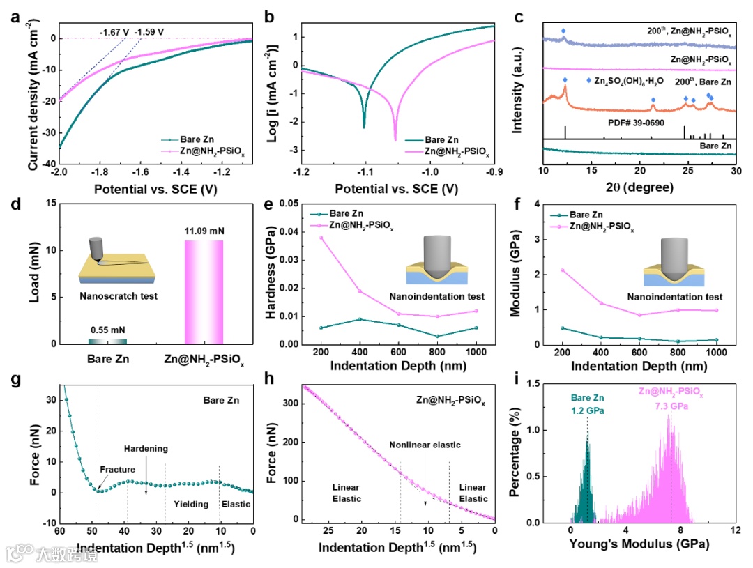图3 Bare Zn和Zn@NH2-PSiOx的(a) LSV曲线,(b) LP曲线,(c) XRD谱图,以及Bare Zn和Zn@NH2-PSiOx循环三次后的(d) 划痕测试,(e, f) 压痕测试,(g, h) 力vs. 压入深度;(i) 杨氏模量直方图。