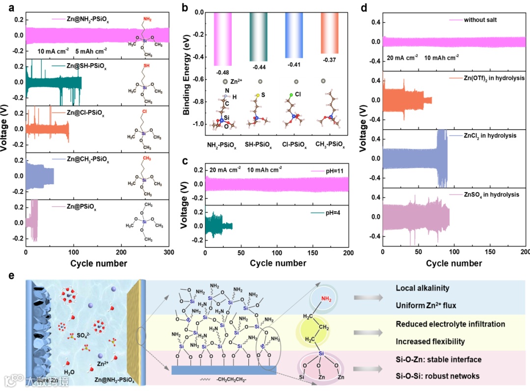 图5 (a) Zn@NH2-PSiOx, Zn@SH-PSiOx, Zn@Cl-PSiOx, Zn@CH3-PSiOx和Zn@PSiOx的循环性能对比图, (b)不同官能团的硅烷分子与锌离子的结合能, (c)在不同pH条件下水解得到的聚硅烷包覆Zn箔的循环性能, (d)无锌盐和有锌盐水解得到的聚硅烷包覆Zn箔的循环性能, (e) 图解说明APTMS的分子结构与电化学性能之间的关系。