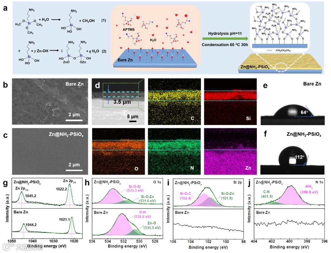图1 (a) Zn@NH2-PSiOx负极的制备流程图,(b, c) Bare Zn和Zn@NH2-PSiOx的SEM图片,(e, f) Bare Zn和Zn@NH2-PSiOx与电解质接触角的光学图片,(d) Zn@NH2-PSiOx的界面SEM图片和EDS映像图,(g-j) Bare Zn和Zn@NH2-PSiOx的XPS光谱。