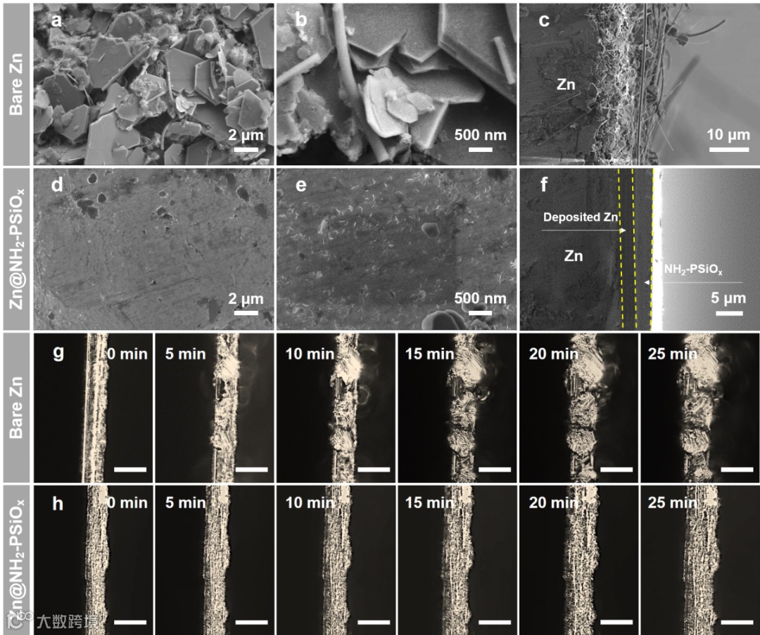 图4 (a-c) Bare Zn在电流密度为6 mA cm-2,面容量为1 mAh cm-2的情况下,经过200次循环后的表面和截面SEM图片,(d-f) 相同情况下Zn@NH2-PSiOx电极表面和截面SEM图片,(g) Bare Zn和 (h) Zn@NH2-PSiOx电极上锌沉积不同时间对应的原位光学观察结果。