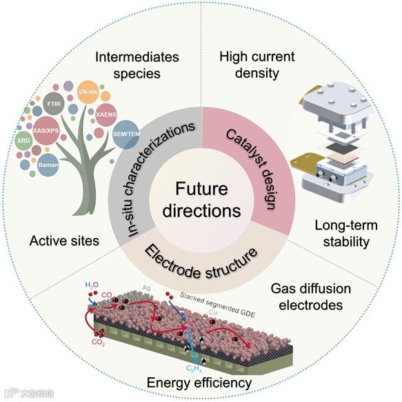 电催化二氧化碳还原是一种很有前途的清洁能源转化方法。虽然相关研究取得了长足的进步,但仍存在一系列不可避免的问题,需要我们去认识和解决。如图2所示,在反应机理研究,高性能及高稳定性催化剂设计,新型电极结构构筑等方面还需要做更多的努力,以加快eCO2RR的基础研究和实际应用。