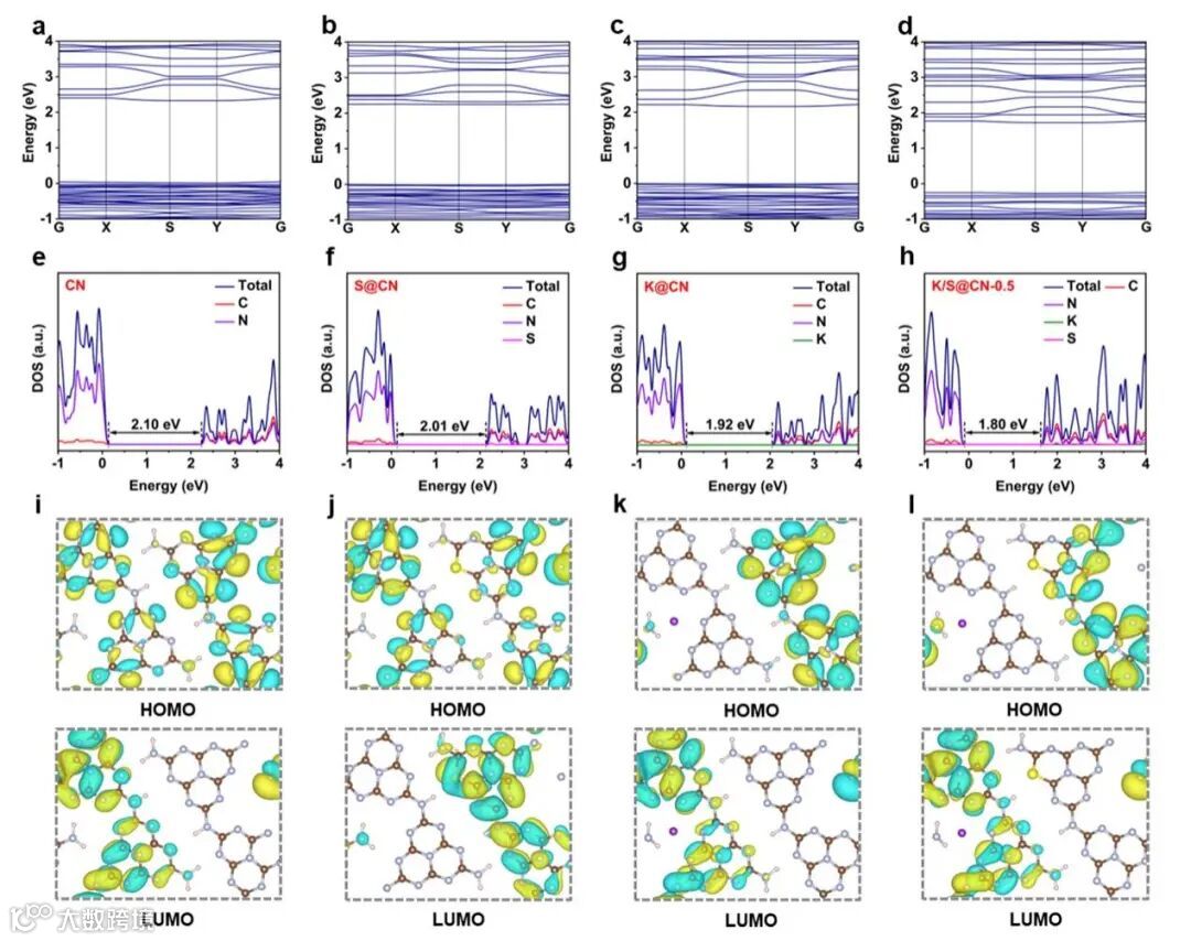 图4. DFT计算CN(a)、S@CN(b)、K@CN(c)和K/S@CN-0.5(d)带隙值。CN(e)、S@CN(f)、K@CN(g)和K/S@CN-0.5(h)的态密度。CN(i)、S@CN(j)、K@CN(k)和K/S@CN-0.5(l)的HOMO和LUMO分布。